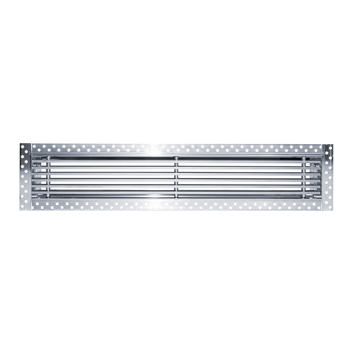 Данная решетка подходит для монтажа на любую поверхность под финишную отделку. Рамка и экран изготовлены из алюминия, опора экрана - из оцинкованной стали. Рама оснащена «полкой» 1,9 мм и рифлеными краями для большей адгезии финишного материала – шпатлевки, цемента. Решетка имеет съемную центральную часть с фиксированным углом наклона ламелей 0°. Она крепится к корпусу прочными металлическими тросиками, легко снимается для очистки и удобного обслуживания.