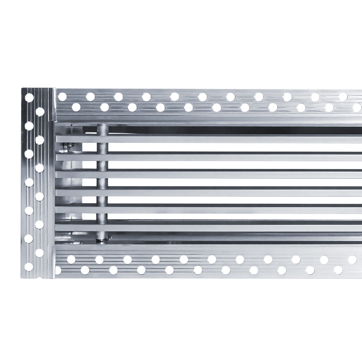Данная решетка подходит для монтажа на любую поверхность под финишную отделку. Рамка и экран изготовлены из алюминия, опора экрана - из оцинкованной стали. Рама оснащена «полкой» 1,9 мм и рифлеными краями для большей адгезии финишного материала – шпатлевки, цемента. Решетка имеет съемную центральную часть с фиксированным углом наклона ламелей 0°. Она крепится к корпусу прочными металлическими тросиками, легко снимается для очистки и удобного обслуживания.