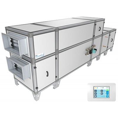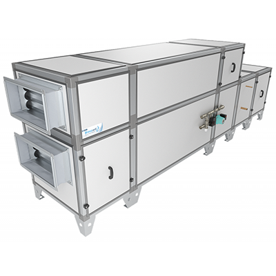 - Приточно-вытяжная установка напольного типа с противоточным пластинчатым рекуператором (с системой защиты от замерзания, эффективный рабочий температурный диапазон до -35°С.