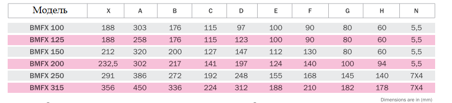 • Вентилятор изготовлен из пластика (модели BFMX 100 – BFMX 200), а у моделей BFMX 250 и BFMX 315 стальной корпус покрытый электростатической порошковой краской.